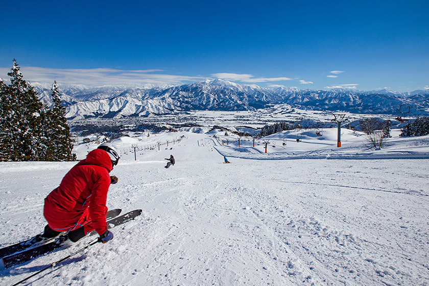 越後三山に向かい合うような絶景が楽しめる上に、緩めの斜面はお子様の上達に最適です。